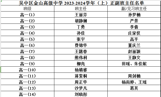 吴中区金山高级中学2023——2024学年(上)正副班主任名单