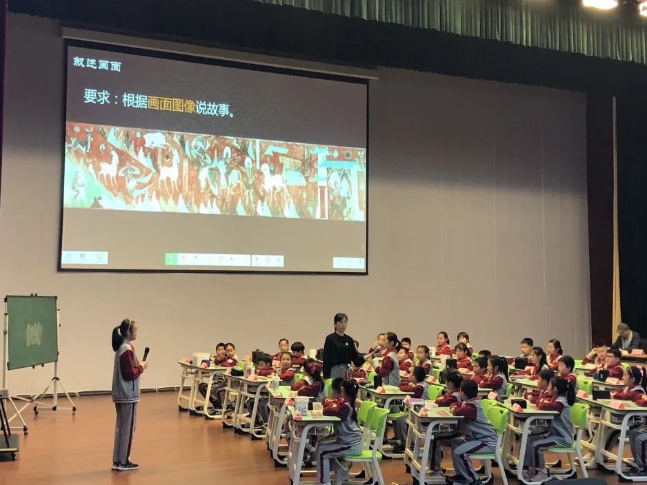 首先,奚秀云老师为大家带来了一堂妙趣横生的《敦煌壁画九色鹿第一课时》,教师紧扣初观画面,走进画面和叙述画面三个教学环节展开《鹿王本生图》的初步探讨,让学生自然走进作品并与它互动交流,从而建立起形象与感受的内通道。