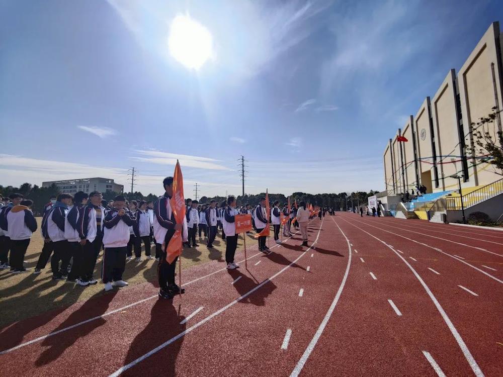 国旗伸展,校徽高擎,伴着激昂的音乐,踏着坚定的步伐,国旗护卫队列队严整、精神抖擞,率先走上赛道。