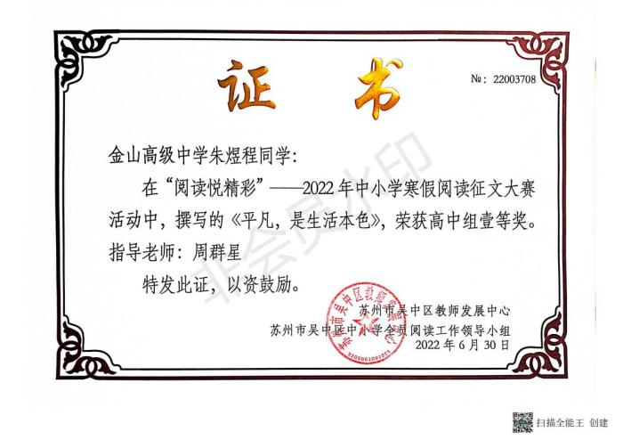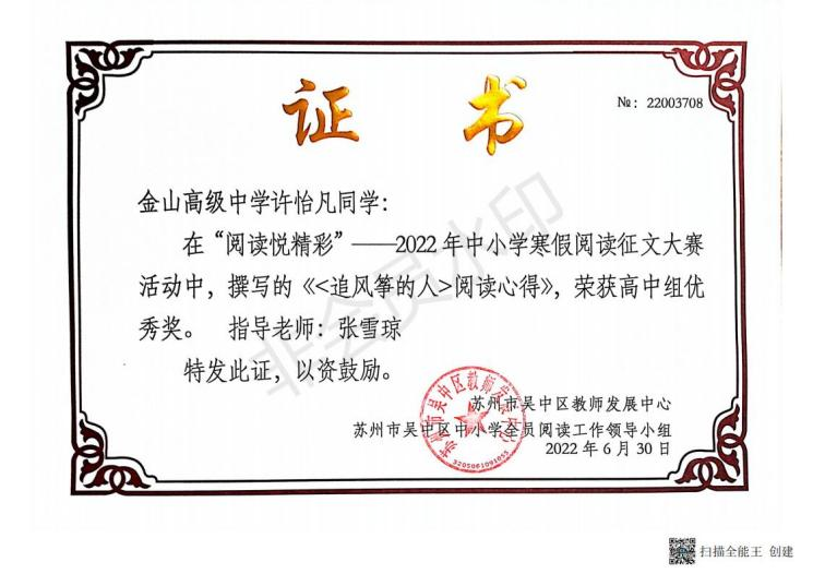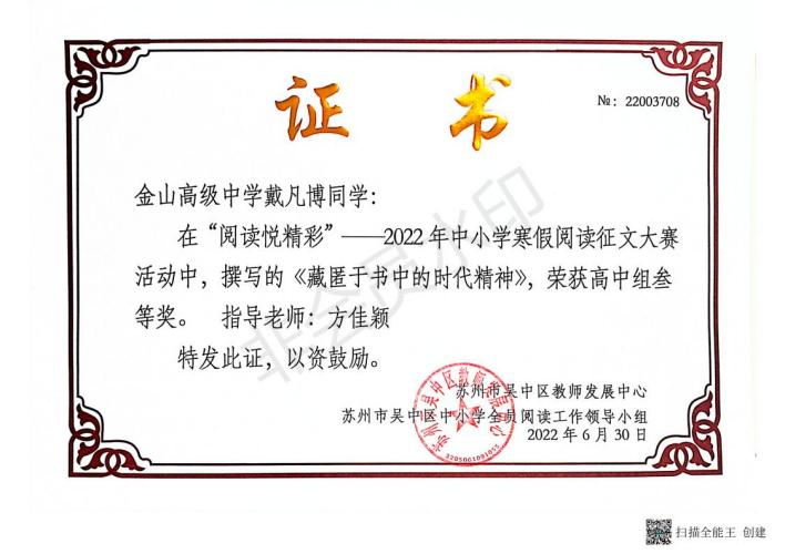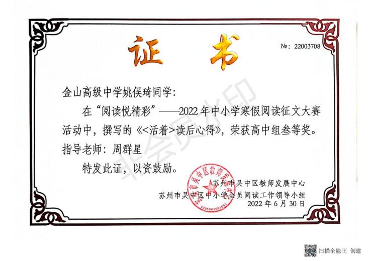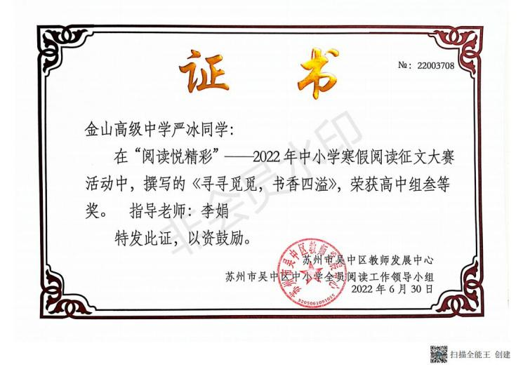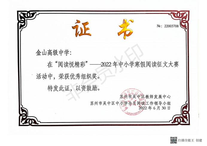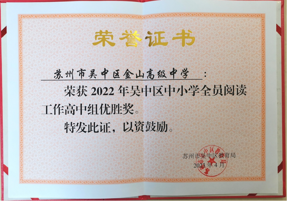 近日,在吴中区第三届中小学全员阅读工作颁奖大会上,我校受到组委会表彰,被授予“吴中区中小学全员阅读工作高中组优胜奖”。成绩的取得令人欣喜,鼓舞我们齐心协力共同打造更有内涵的“书香校园”而继续奋斗。