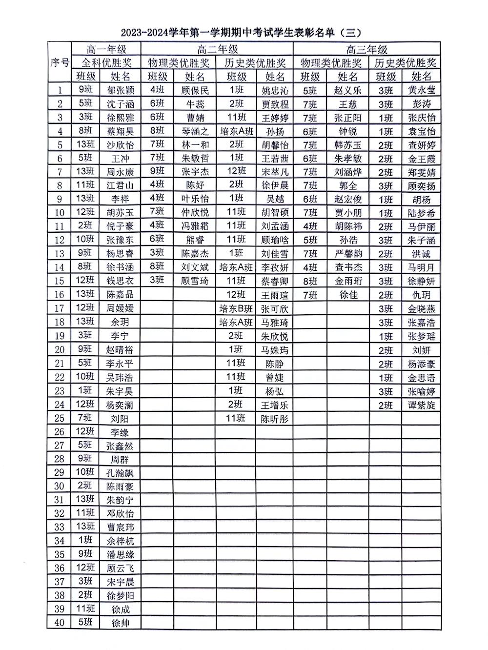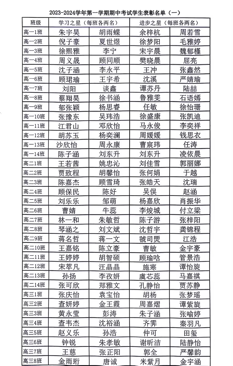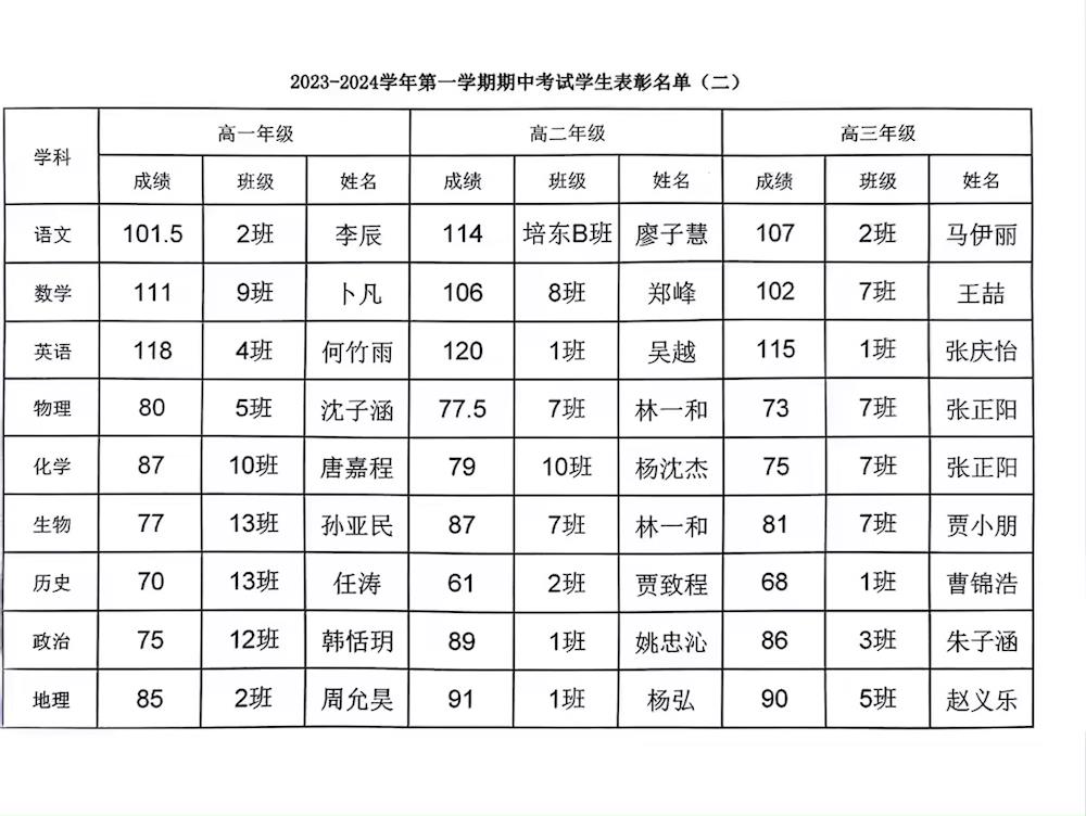 2023-2024学年第一学期期中考试学生表彰名单