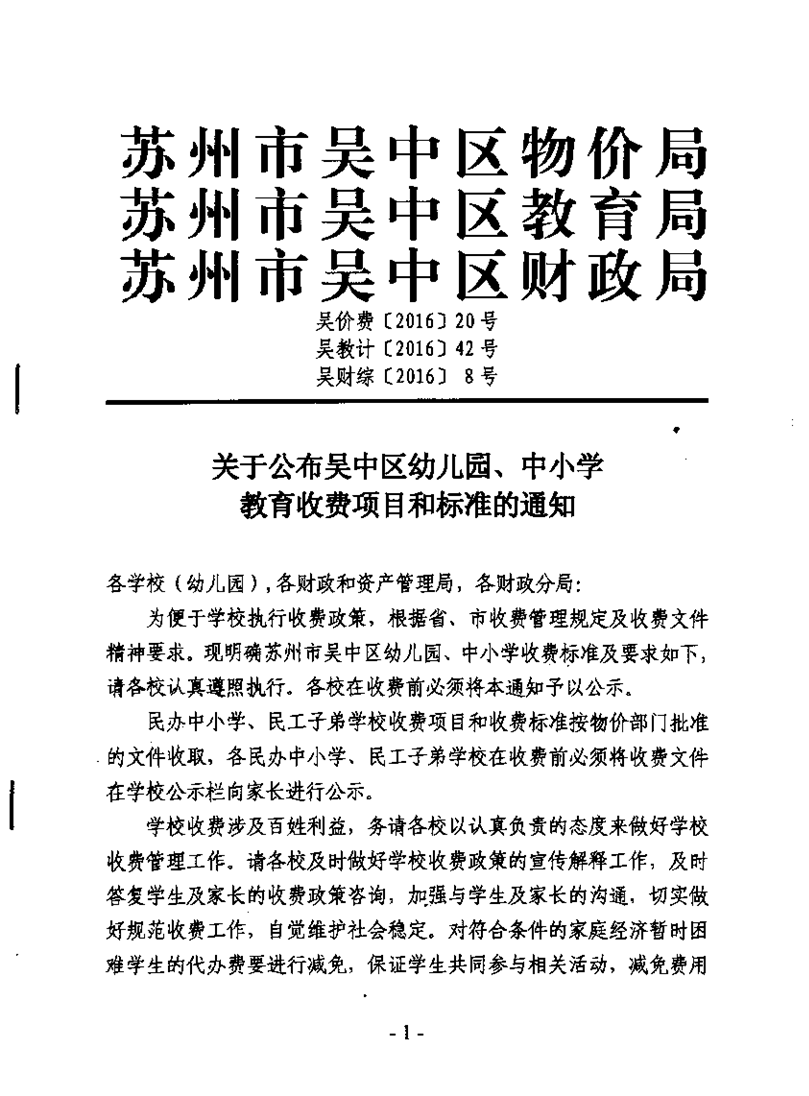 关于公布吴中区幼儿园、中小学教育收费项目和标准的通知