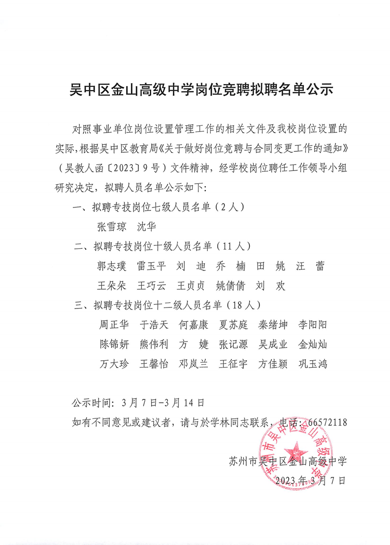 吴中区金山高级中学岗位竞聘拟聘名单公示(2023.03)